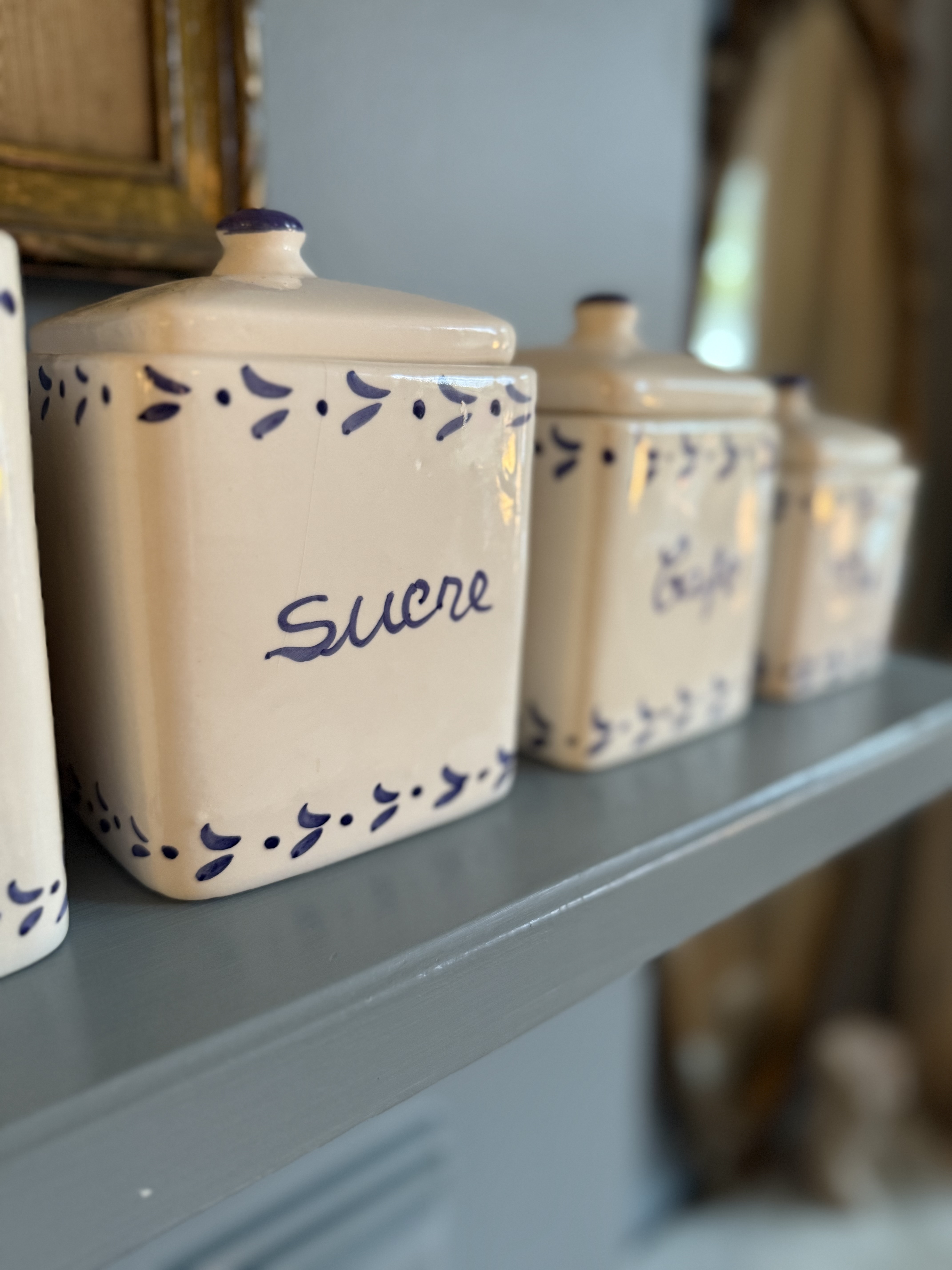 Bring effortless European charm to your kitchen with this vintage-inspired ceramic canister set, curated for the discerning Antourakis home. Featuring delicate hand-painted blue accents and graceful script labels — “Farine” (flour), “Sucre” (sugar), “Café” (coffee) and “Thé” (tea) — this four-piece set blends traditional French country elegance with everyday functionality.