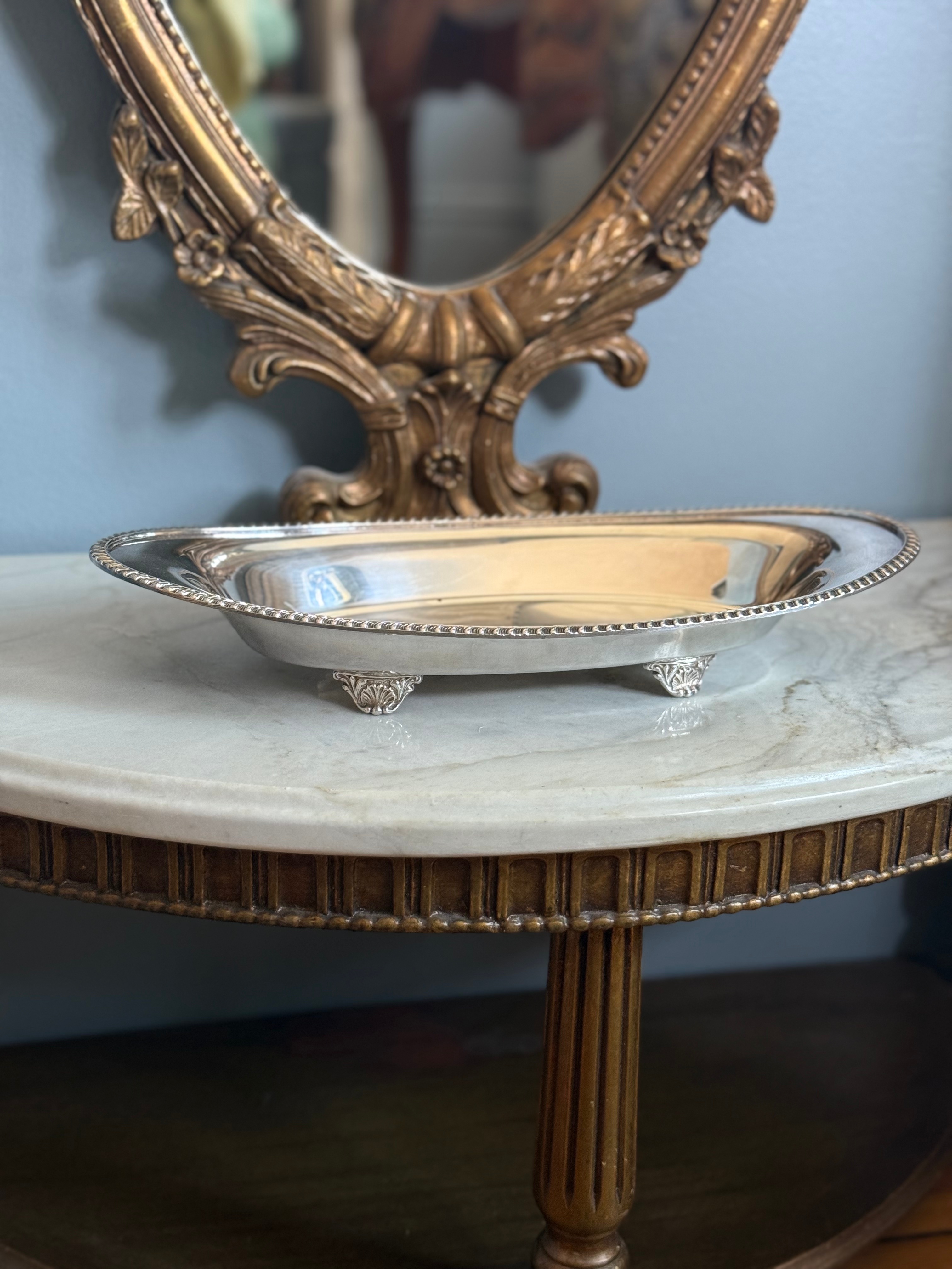 Add a little wow to your tabletop with this medium-sized Crescent silverplate bowl. Its sleek, shallow oval shape is beautifully complemented by a roping design on the exterior and decorative feet that elevate its vintage charm. It’s a piece that says, “I’m functional, but make it fabulous.”