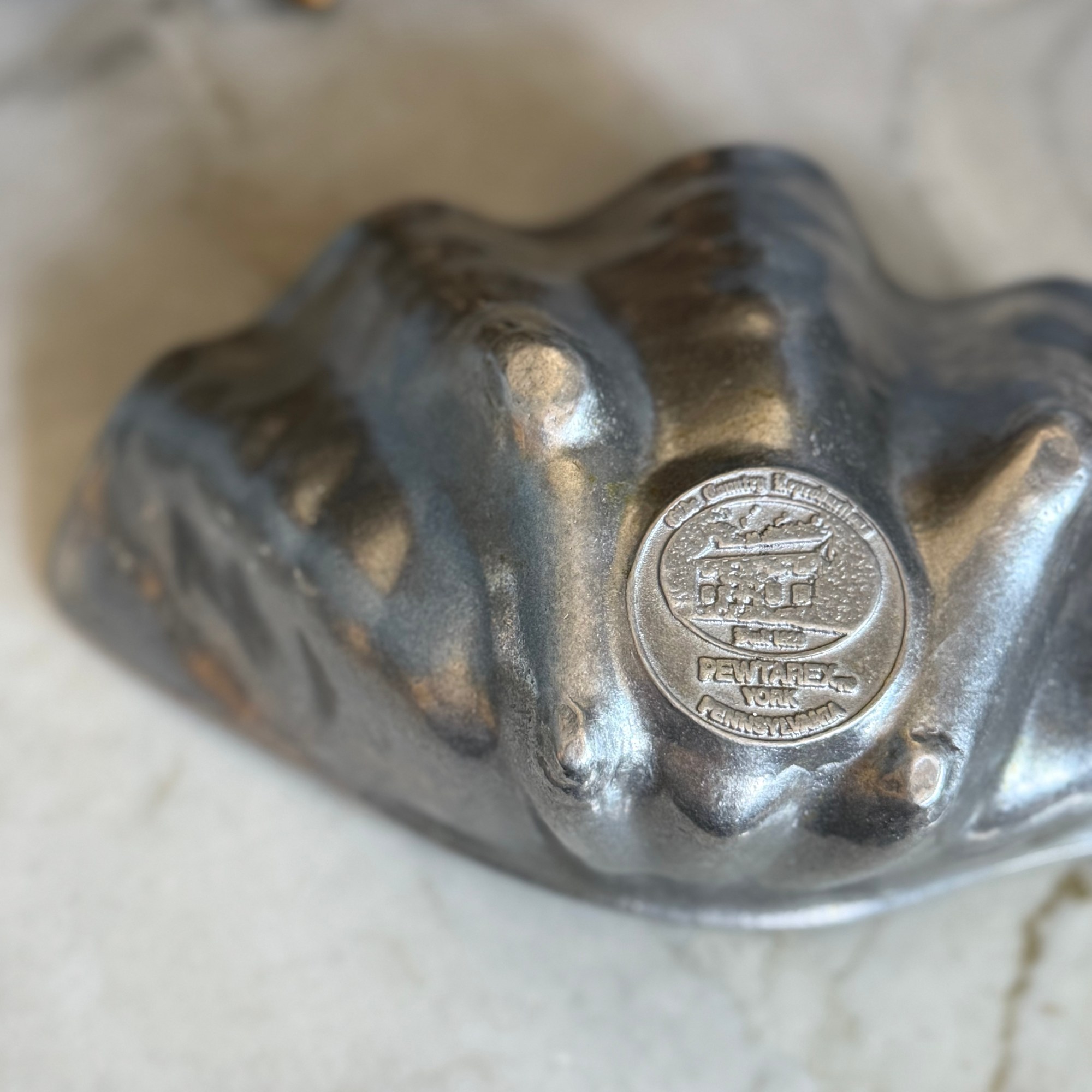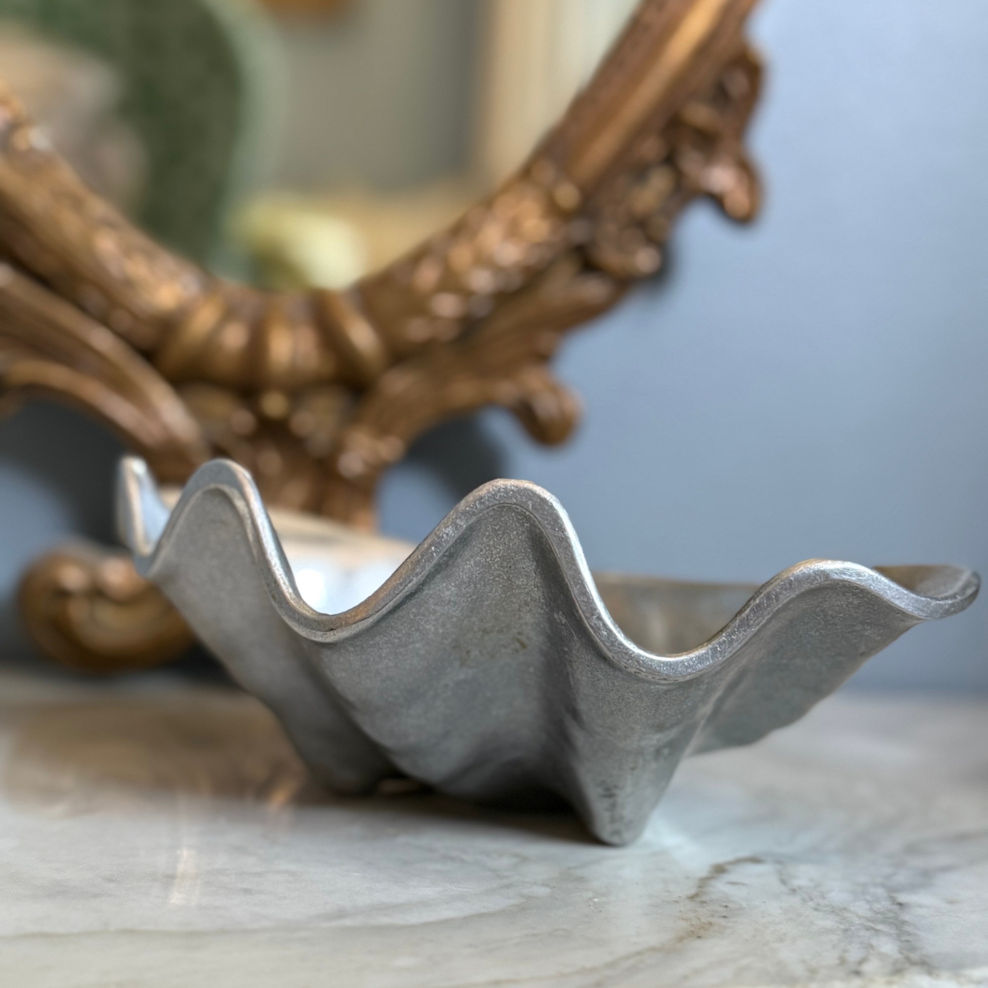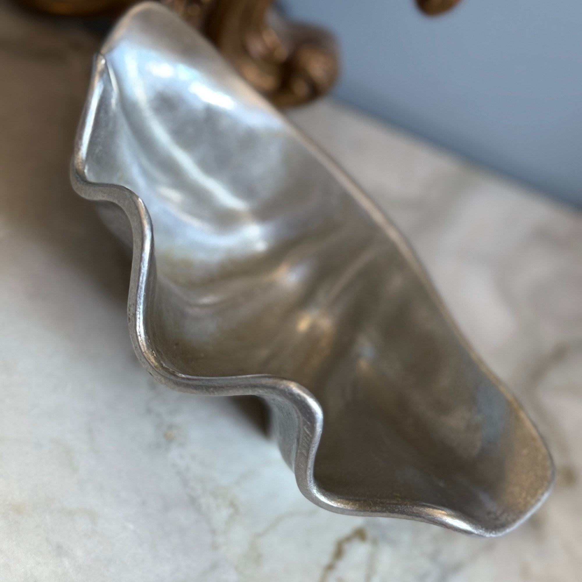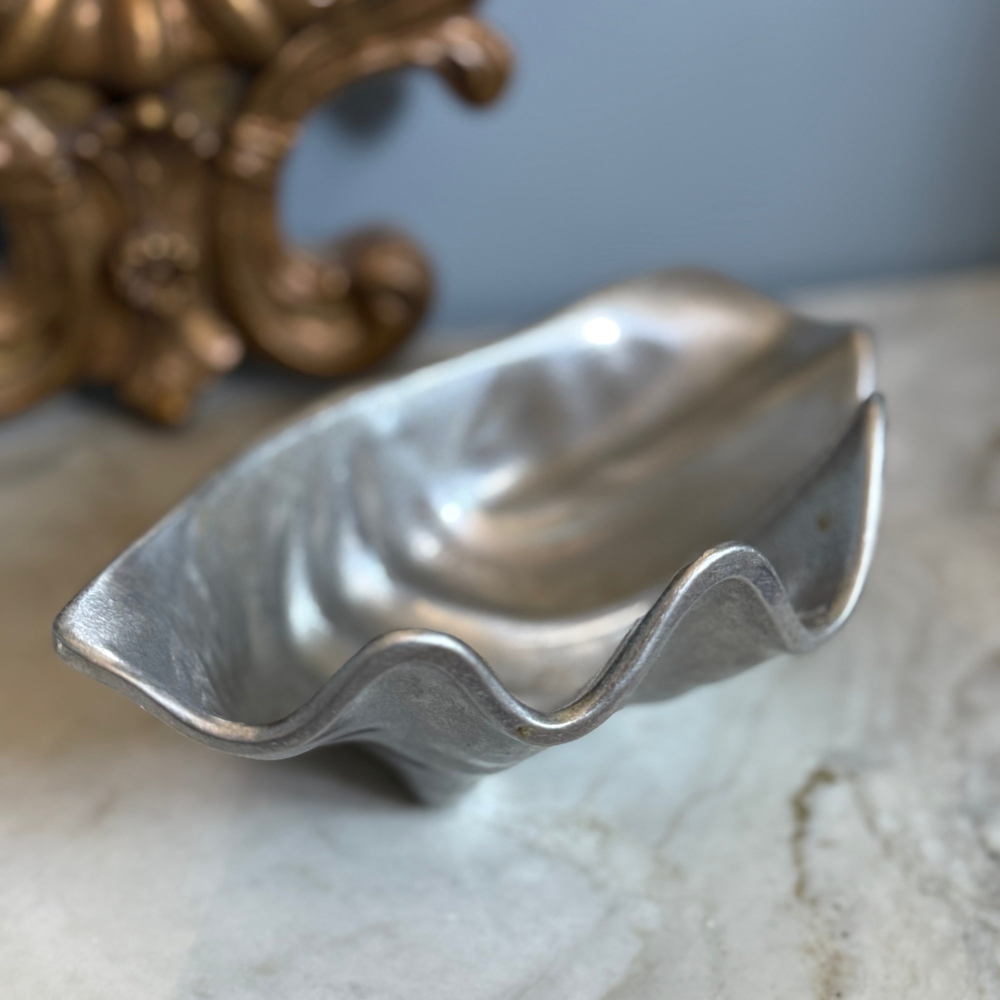 Make waves with this fabulous vintage Pewtarex clam shell bowl, where seaside charm meets silvery sophistication. With its sculptural shell shape and shimmering finish, it’s perfect for serving up snacks, holding jewelry, or just sitting pretty as a conversation-starting centerpiece.